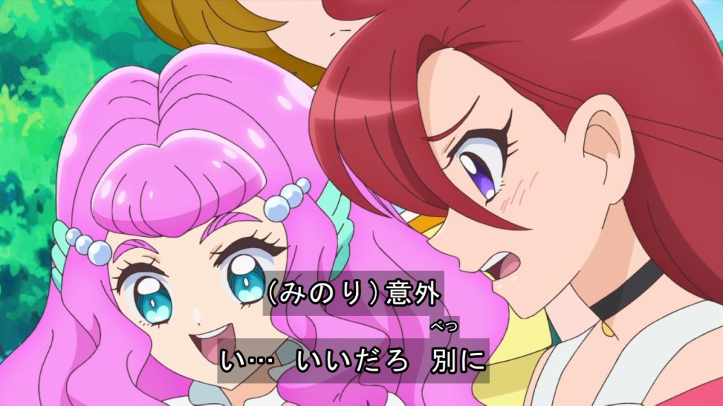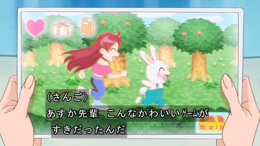 かわいい系のゲームが好きなあすか先輩が可愛い。クールで頼れる一面はまだ保っているけど、まなつに対して見せたノリの良さだったり突っ込み気質だったりと仲が深まる程に色々な面を見せてくれそうで楽しみ。頭脳担当や場を落ち着かせる役回りはみのりん先輩やさんごが請負そうだし、やっぱりあすか先輩はどちらかと言うとまなつやローラ側の方なんじゃないかというイメージが強くなった。